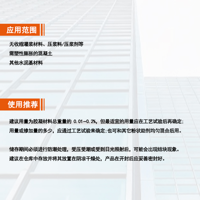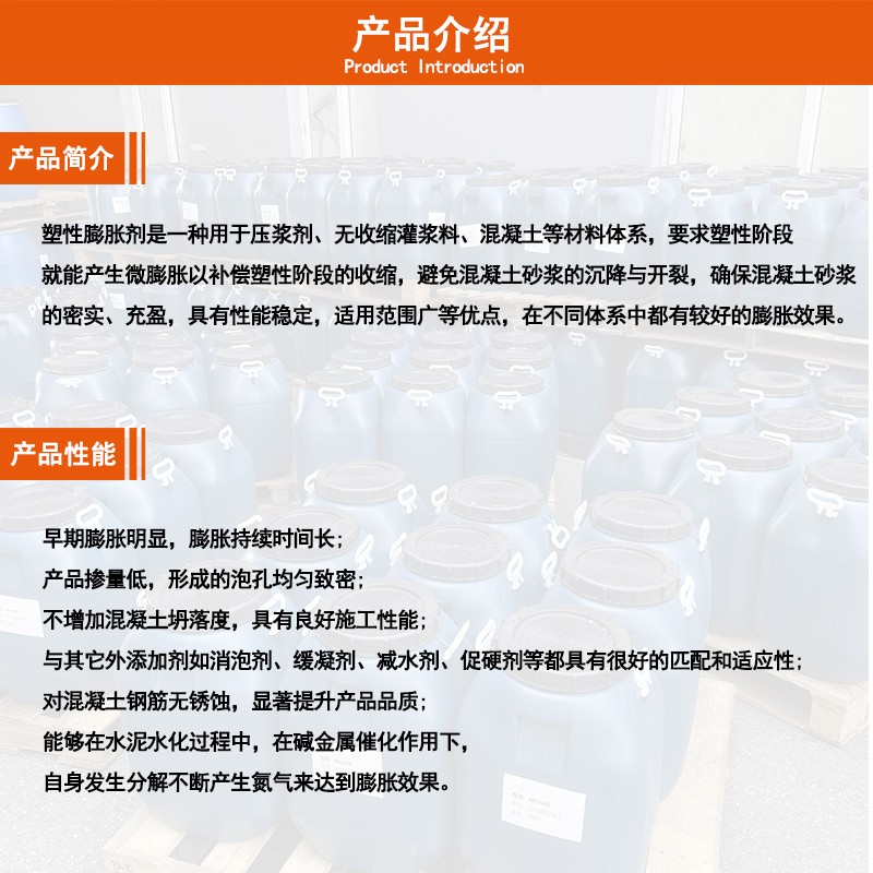 塑性膨胀剂是一种用于压浆剂、无收缩灌浆料、混凝土等材料体系,要求塑性阶段就能产生微膨胀以补偿塑性阶段的收缩,避免混凝土砂浆的沉降与开裂,确保混凝土砂浆的密实、充盈,具有性能稳定,适用范围广等优点,在不同体系中都有较好的膨胀效果。